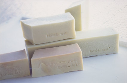 ●RAVIDA-05+++ :Ravida-jojoba soap / すぐれた洗浄力と保水力が特徴のEX.Virgin Olive Oilだけがベースの石鹸(RAVIDA-neut+++)に、そのままホホハ ゙オイルを加えて固めた、まっすぐ素直な潤い石鹸。ほんのりと香るのはローズマリー精油。若さを保つとされる浄化のハ ーブです。グレイッシュな色合いは、潤う粘土・ガスールのしわざ。乾燥しがちな肌へ。R=neut+++とR-25++++の中間に位 置する感触。秋冬春に製造。/ half narrow ingot≠63g